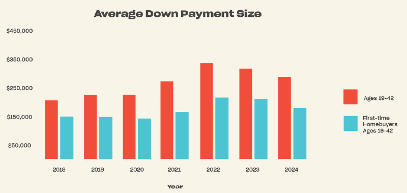 Soaring Down Payments: The average down payment for buyers aged 19-42 in 2024 was $287,300, a 37% increase from 2018. For first-time buyers, the average down payment rose by 20%, reaching $179,000 in 2024.