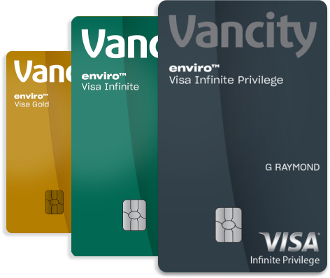 ◊ You will earn more points per $1 on eligible purchases made with an enviro Visa Infinite and enviro Visa Infinite Privilege card. Eligibility is based on the merchant code as classified in the Visa credit card network. Purchases made at merchants classified as (i) Grocery Stores; Freezer and Locker Meat Provisioners; Candy Stores; Dairy Product Stores; Bakeries; and Misc. Food Stores – Convenience Stores and Specialty Markets are “groceries” and earn 2.5 points with every $1 purchase; (ii) Local/Suburban Commuter Passenger Transportation – Railroads; and Transportation Services Not Elsewhere Classified are “public transit and ferries” and earn 5 points with every $1 purchase. Some merchants may sell these products/services or are separate merchants who are located on the premises of these merchants, but are classified by the Visa credit card network in another manner, in which case the accelerated earn rate will not apply. Points are earned based on the dollar amount of Purchases you make on your Card. You will not earn Points on Cash Advances, Cash-Like Transactions, Balance Transfers, writing Visa Cheques or for the amounts you pay in interest, annual fees or any other types of fees on your Visa Account. For a full list of terms and conditions, see Vancity Rewards Program terms and conditions.
